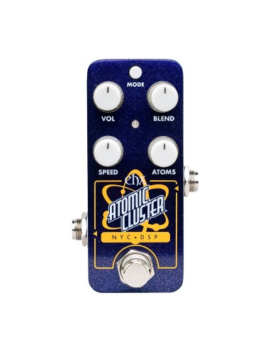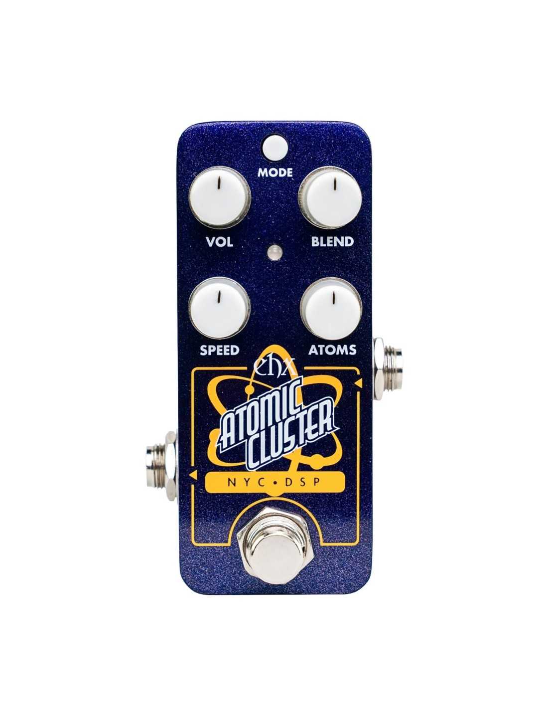 The Electro-Harmonix Atomic Cluster Spectral Decomposer features two primary controls: ATOMS and SPEED. ATOMS determines the number of simultaneous resonant oscillations generated at any given moment, ranging from a full spectrum of your input signal to a single note. More oscillations result in a tone closer to your original signal, while fewer oscillations create a pixelated, glitchier sound. SPEED adjusts how fast the pedal refreshes these oscillations, controlling the timing and rhythm of the effect. Slower settings can emulate a rhythmic step filter, whereas faster settings create chaotic, randomized textures. SPEED can also be controlled via tap tempo. Additional VOL and BLEND knobs adjust the overall output level and wet/dry mix.