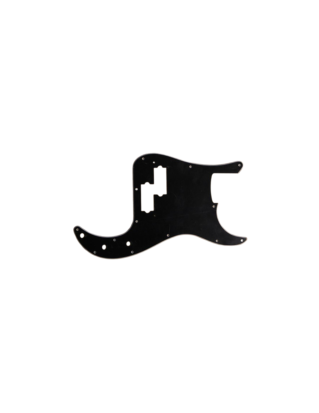 Pickguard for Precision Bass-type guitars, black, 3-ply, made in Japan. Features 13 mounting holes, cutouts for pickup screws, and two holes for pickup covers.